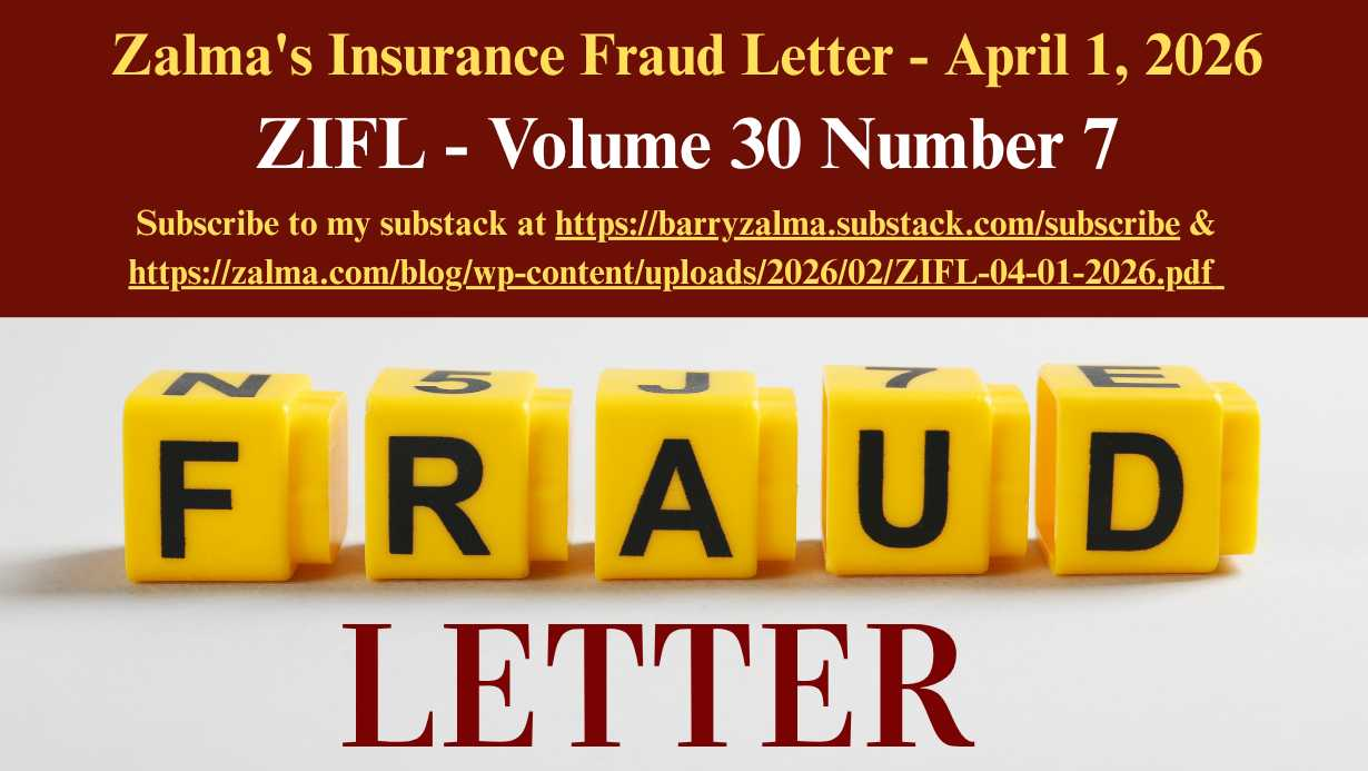 Zalma’s Insurance Fraud Letter (ZIFL) continues its 30th year of publication dedicated to those involved in reducing the effect of insurance fraud. ZIFL is published 24 times a year by ClaimSchool and is written by Barry Zalma. It is provided FREE to anyone who visits the site at http://zalma.com/zalmas-insurance-fraud-letter-2/ This issue contains the following articles about insurance fraud: