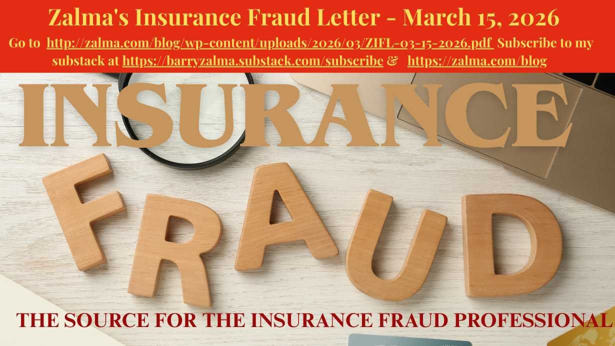 Zalma’s Insurance Fraud Letter (ZIFL) continues its 30th year of publication dedicated to those involved in reducing the effect of insurance fraud. ZIFL is published 24 times a year by ClaimSchool and is written by Barry Zalma. It is provided FREE to anyone who visits the site at http://zalma.com/zalmas-insurance-fraud-letter-2/ This issue contains the following articles about insurance fraud: